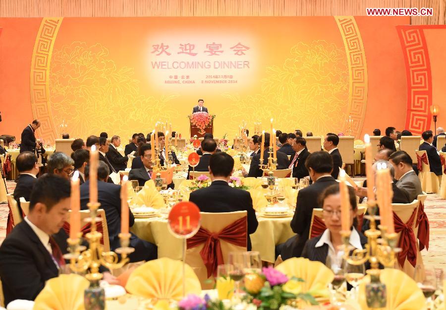 Chinese President Xi Jinping addresses a welcoming dinner for the Dialogue on Strengthening Connectivity Partnership in Beijing, capital of China, Nov. 8, 2014. (Xinhua/Wang Ye)