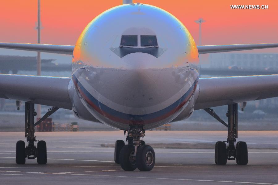 The plane carrying Russian President Vladimir Putin lands at the Capital International Airport of Beijing, capital of China, Nov. 9, 2014. Putin is in Beijing to attend the 22nd Asia-Pacific Economic Cooperation (APEC) Economic Leaders' Meeting which will be held in Beijing from Nov. 10 to 11. (Xinhua/Xing Guangli)