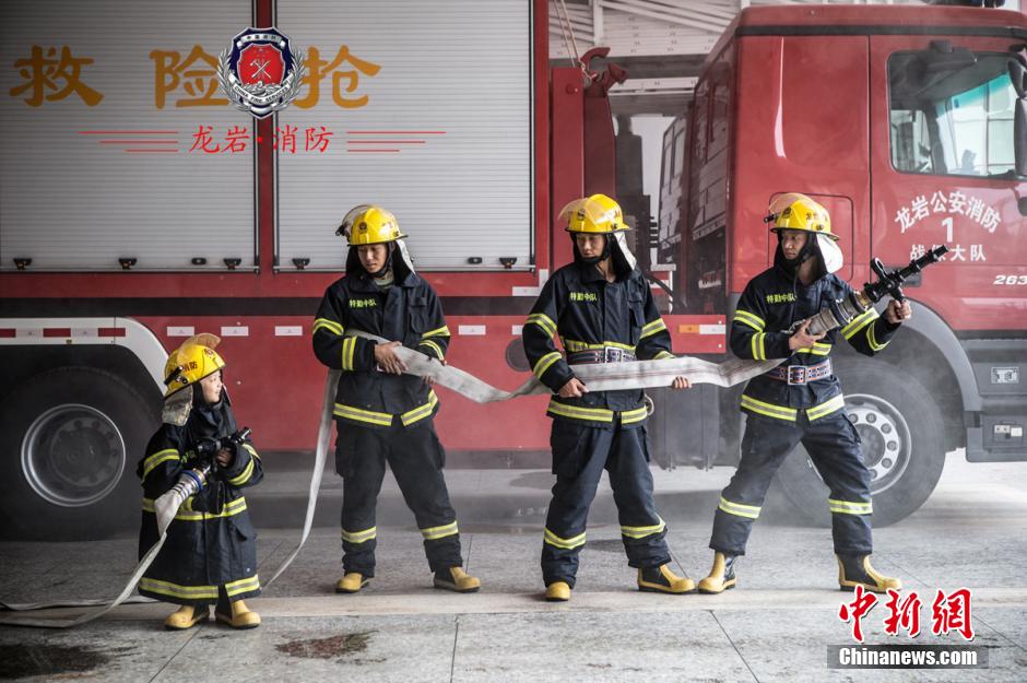 This group of photos is a birthday gift from the firefighters of Longyan Fire Department to Zhuang Yuming, who is a little fan of firefighters. In order to help Zhuang realize his dream, the firefighters decided to give him this special birthday present by making him mini firefighter uniform, and arranging a photo shoot with them in the fire department.