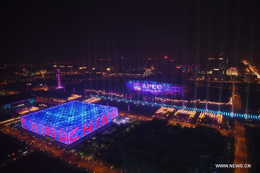 Photo taken on Nov. 10, 2014 shows the night view of the National Gymnasium (the "Bird Nest") and the National Aquatics Center (the "Water Cube") and their surroundings ahead of the 22nd Asia-Pacific Economic Cooperation (APEC) Economic Leaders' Meeting in Beijing, capital of China. The 22nd APEC Economic Leaders' Meeting is held in Beijing from Nov. 10 to 11. (Xinhua/Chen Yehua)