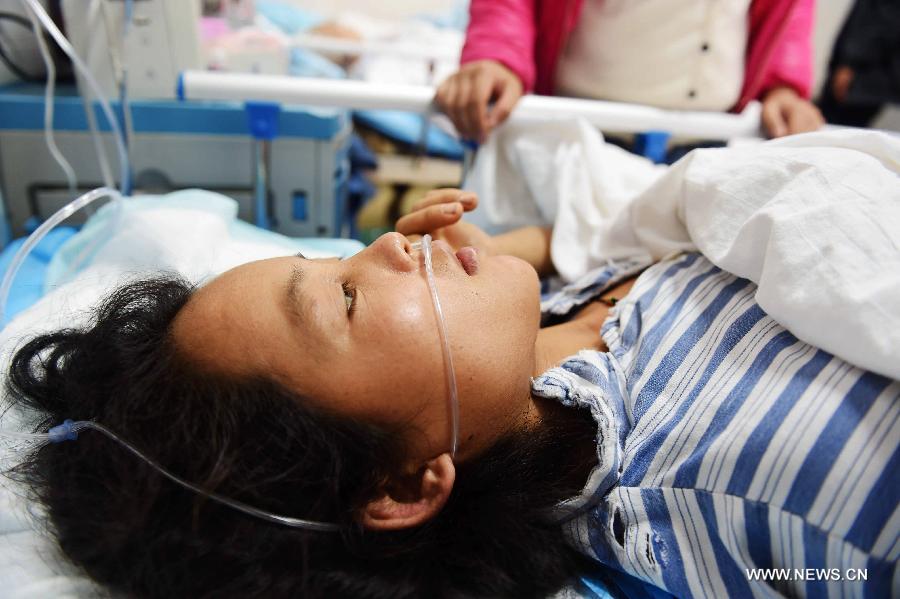 | An injured woman receives treatment at the Renmin Hospital in Du'an Yao Autonomous County, south China's Guangxi Zhuang Autonomous Region, Nov. 10, 2014. Nine people were killed and five others injured when the overloaded vehicle drove off a cliff here on Nov. 9. (Xinhua/Zhang Ailin) |