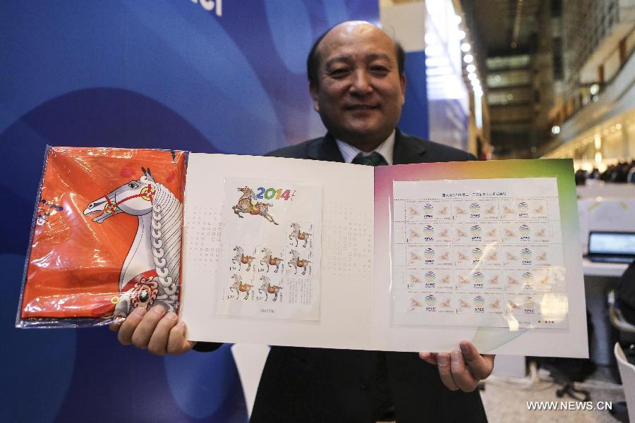 A working staff member shows the commemorative stamps album for the 22nd Asia-Pacific Economic Cooperation (APEC) Economic Leaders' Meeting at the China National Convention Center in Beijing, capital of China, Nov. 9, 2014. The first-day cover and commemorative stamps for the 22nd APEC Economic Leaders' Meeting are released here Sunday. (Xinhua/Zhang Yuwei)