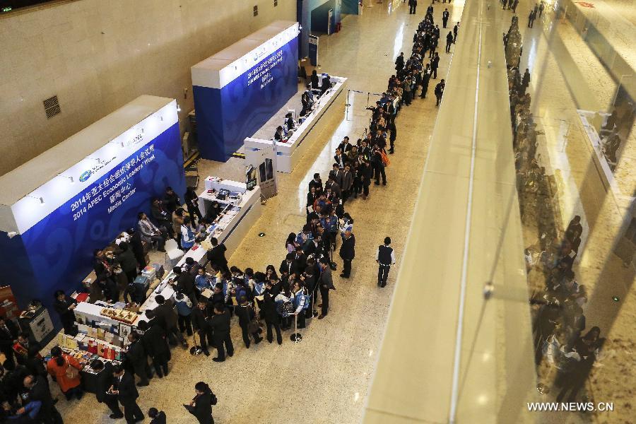 | People wait to buy the first-day cover and commemorative stamps for the 22nd Asia-Pacific Economic Cooperation (APEC) Economic Leaders' Meeting at the China National Convention Center in Beijing, capital of China, Nov. 9, 2014. The first-day cover and commemorative stamps for the 22nd APEC Economic Leaders' Meeting are released here Sunday. (Xinhua/Zhang Yuwei) |