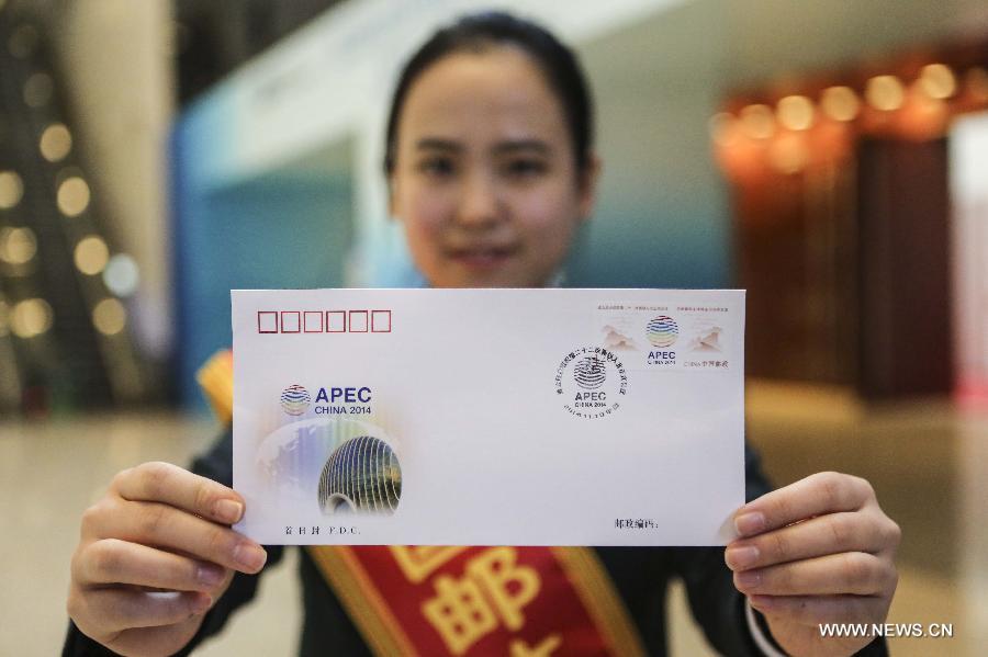 A working staff member shows the first-day cover for the 22nd Asia-Pacific Economic Cooperation (APEC) Economic Leaders' Meeting at the China National Convention Center in Beijing, capital of China, Nov. 9, 2014. The first-day cover and commemorative stamps for the 22nd APEC Economic Leaders' Meeting are released here Sunday. (Xinhua/Zhang Yuwei)