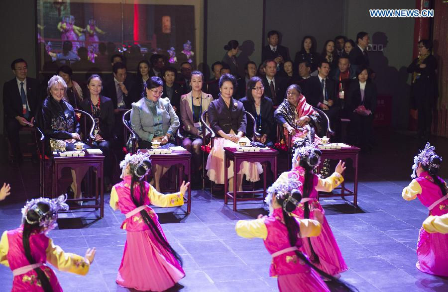 Chinese President Xi Jinping's wife Peng Liyuan and guests watch Peking Opera show at the Capital Museum in Beijing, capital of China, Nov. 9, 2014. Peng invited wives of Bangladesh President Abdul Hamid, Mongolian President Tsakhiagiin Elbegdorj and Shanghai Cooperation Organization Secretary-General Dmitry Mezentsev to the Capital Museum on Sunday. (Xinhua/Huang Jingwen)