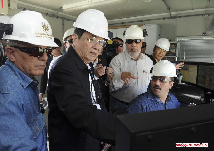 Yu Zhengsheng (C, front), chairman of the National Committee of Chinese People's Political Consultative Conference (CPPCC), inquires about the production of potash on a mining ship during his visit to the Arab Potash Company (APC) in Amman, Jordan, Nov. 8, 2014. (Xinhua/Zhang Duo)