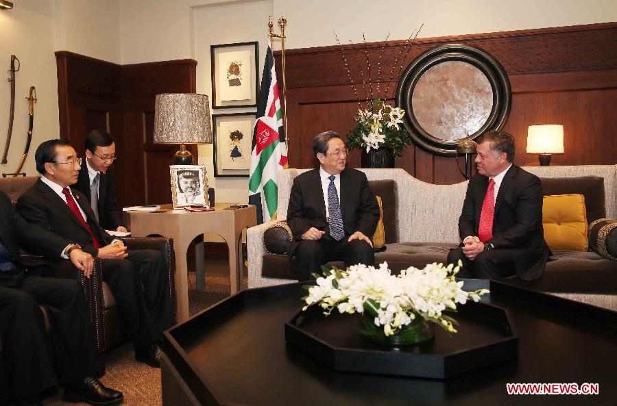 Yu Zhengsheng (2nd R), chairman of the National Committee of Chinese People's Political Consultative Conference (CPPCC), meets with King Abdullah II of Jordan (1st R) in Amman, Jordan, Nov. 9, 2014. (Xinhua/Liu Weibing)