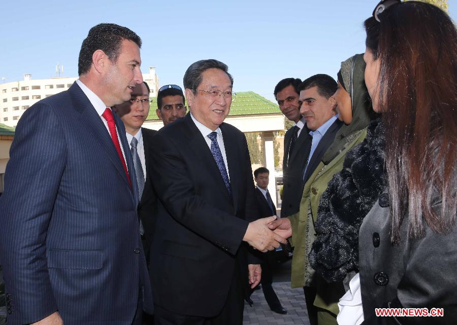 Yu Zhengsheng (C), chairman of the National Committee of Chinese People's Political Consultative Conference (CPPCC), meets with Jordan's Acting House Speaker Ahmad Safadi (1st L) in Amman, Jordan, Nov. 9, 2014. (Xinhua/Liu Weibing)