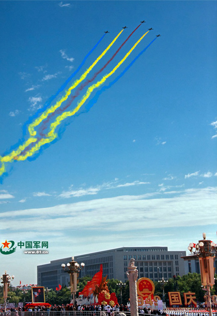 Tao Jiali and her team members flew over Tiananmen Square in K-8 on Oct.1, 2009 to celebrate the 60th anniversary of the founding of New China. (Chinamil.com.cn/Tan Chao)