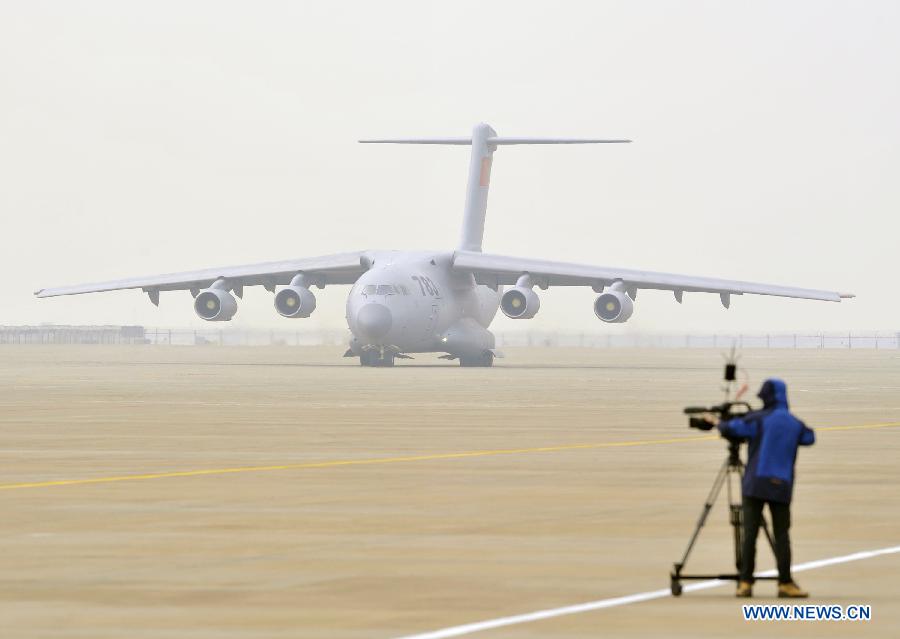 China's Y-20 military transport aircraft performs at the 10th China International Aviation and Aerospace Exhibition in Zhuhai, south China's Guangdong Province, Nov. 11, 2014. Some 700 exhibitors at home and abroad with 130-plus planes attended the airshow from Nov. 11 to 16. (Xinhua/Liang Xu)
