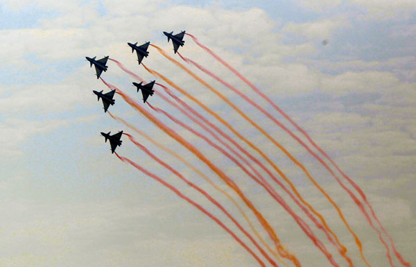 | The PLA air force Bayi aerobatics team performs at the 10th China International Aviation and Aerospace Exhibition in Zhuhai, Guangdong province, on Tuesday. More than 700 companies from China and abroad are attending the show. [Photo by Zou Zhongpin/China Daily] |