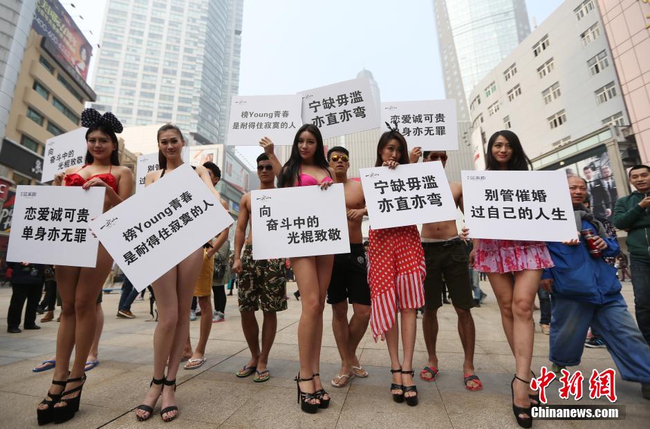 | Placards reading "Although relationships are good, no one has the right to blame on singles", "Only you can decide your life" and "Pay tribute to singles" held by young people wearing summer clothes attract enormous attention in Nanjing, east China's Jiangsu province on Nov. 11, 2014. (CNS/Yang Bo) |