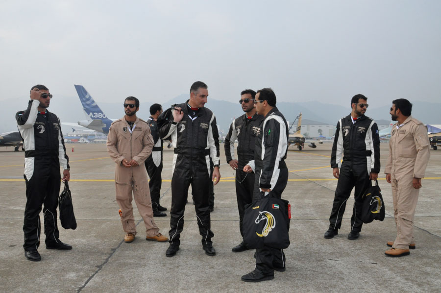 Photo taken on Nov. 11, 2014 shows pilots and mechanics of the United Arab Emirates’ National Aerobatic Team at the 10th China International Aviation & Aerospace Exhibition (Airshow China 2014) held from Nov. 11 to 16 in Zhuhai, south China’s Guangdong province. (People’s Daily Online/ Sun Zhao)