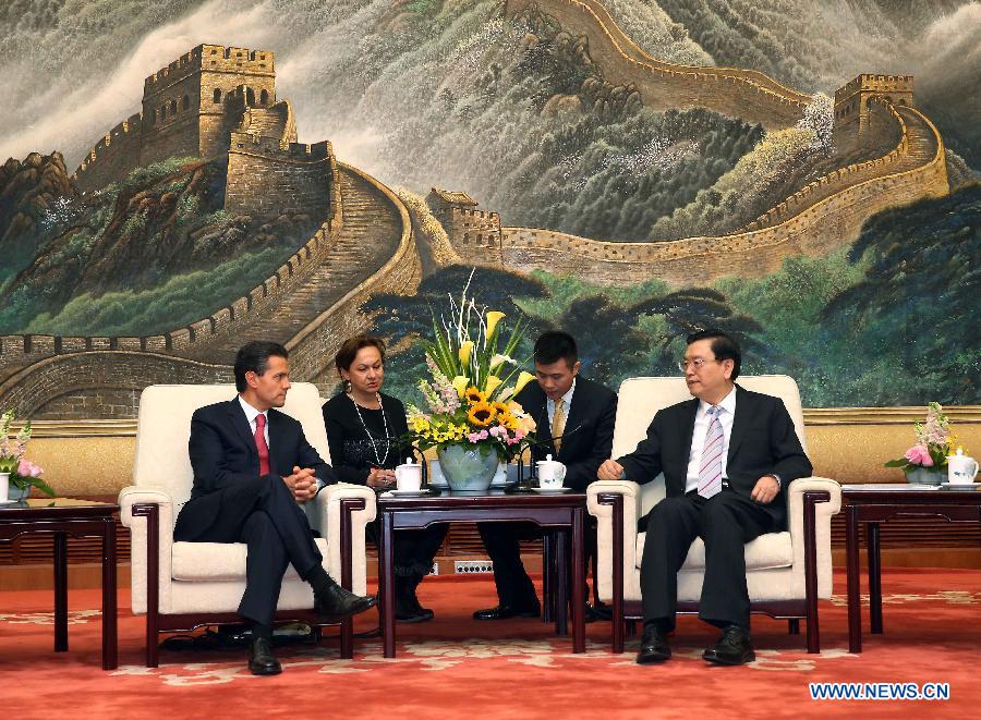 Zhang Dejiang (front R), chairman of the Standing Committee of the National People's Congress, China's top legislature, meets with Mexico's President Enrique Pena Nieto in Beijing, capital of China, Nov. 13, 2014. (Xinhua/Liu Weibing)
