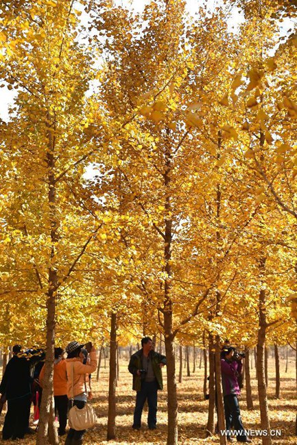Citizens go sightseeing at a ginkgo forest in Ji'nan, capital of east China's Shandong Province, Nov. 13, 2014. (Xinhua/Xu Suhui)