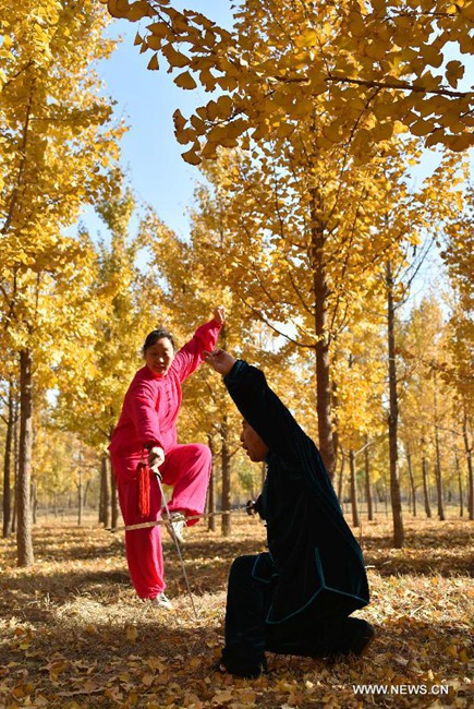 Citizens do exercise at a ginkgo forest in Ji'nan, capital of east China's Shandong Province, Nov. 13, 2014. (Xinhua/Xu Suhui)