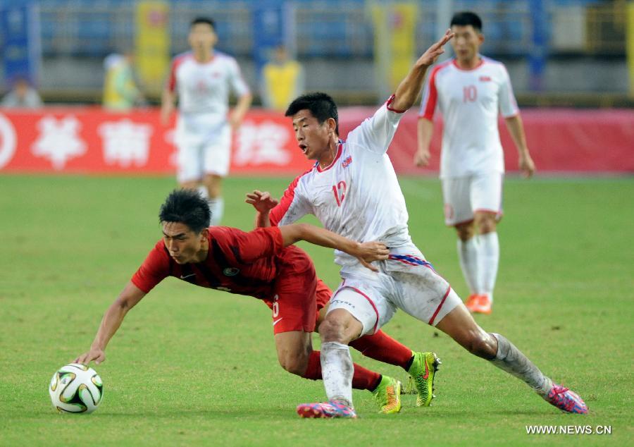 Om Chol Song (R) of the Democratic People's Republic of Korea (DPRK) vies for the ball during the semifinals round match against China's Hong Kong at the 2015 EAFF East Asian Cup in Taipei, southeast China's Taiwan, on Nov. 13, 2014. DPRK won 2-1. (Xinhua/Lo Ping Fai)