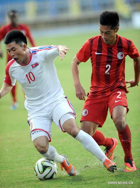 Ri Jin Hyok (L) of the Democratic People's Republic of Korea (DPRK) vies with Lee Chi Ho of China's Hong Kong during their semifinals round match at the 2015 EAFF East Asian Cup in Taipei, southeast China's Taiwan, on Nov. 13, 2014. DPRK won 2-1. (Xinhua/Lo Ping Fai)