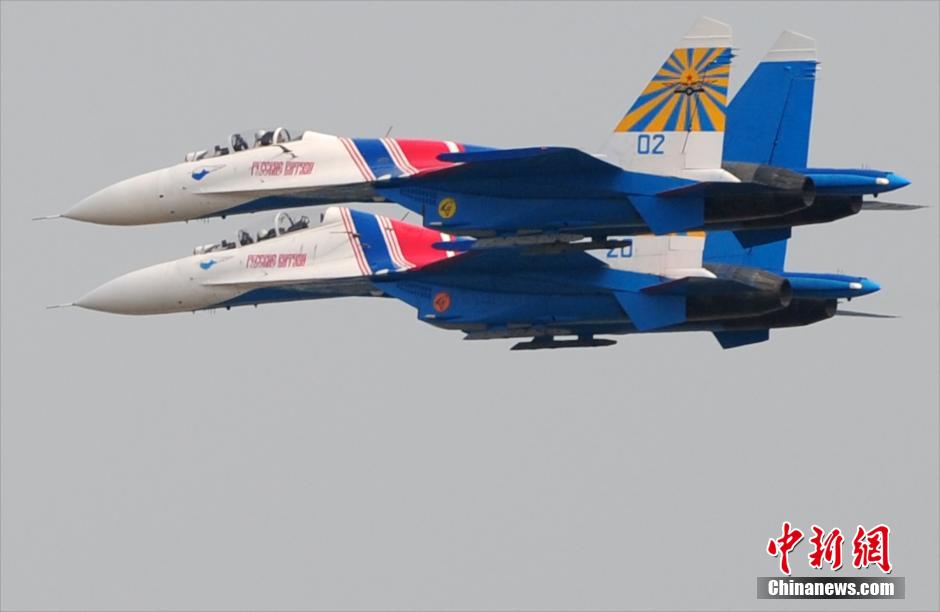 On Nov. 12, 2014, the Bayi Aerobatics Team of the Chinese Air Force, the Russian Knights Aerobatics Team and the United Arab Emirates’ National Aerobatic Team give splendid performances for guests from both home and abroad at the Airshow China 2014 in Zhuhai. (Chinanews/Chen Wen)