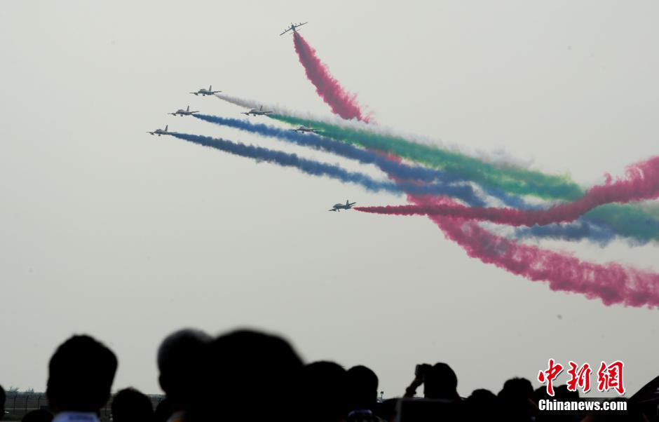 On Nov. 12, 2014, the Bayi Aerobatics Team of the Chinese Air Force, the Russian Knights Aerobatics Team and the United Arab Emirates’ National Aerobatic Team give splendid performances for guests from both home and abroad at the Airshow China 2014 in Zhuhai. (Chinanews/Chen Wen)