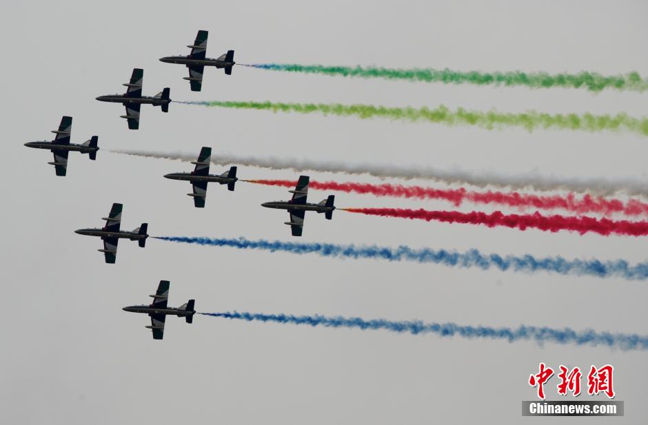 On Nov. 12, 2014, the Bayi Aerobatics Team of the Chinese Air Force, the Russian Knights Aerobatics Team and the United Arab Emirates’ National Aerobatic Team give splendid performances for guests from both home and abroad at the Airshow China 2014 in Zhuhai. (Chinanews/Chen Wen)