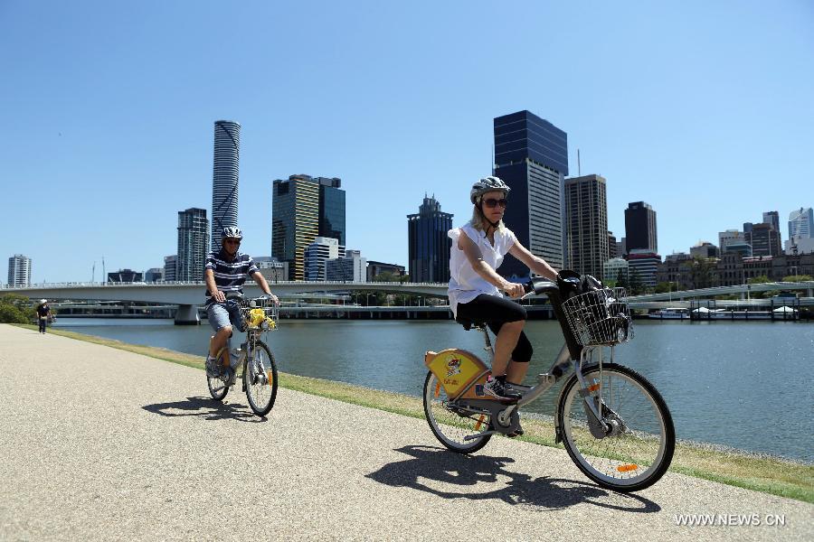 People ride on the bank of the Brisbane River in Brisbane, Australia, on Nov. 14, 2014. The G20 summit will be held on Nov. 15-16 in Brisbane. (Xinhua/Zhao Danhui)