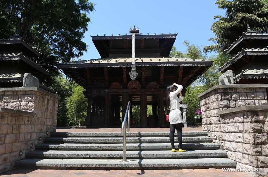 | A woman visits the Nepalese Peace Pagoda in Brisbane, Australia, on Nov. 14, 2014. The G20 summit will be held on Nov. 15-16 in Brisbane. (Xinhua/Zhao Danhui) |