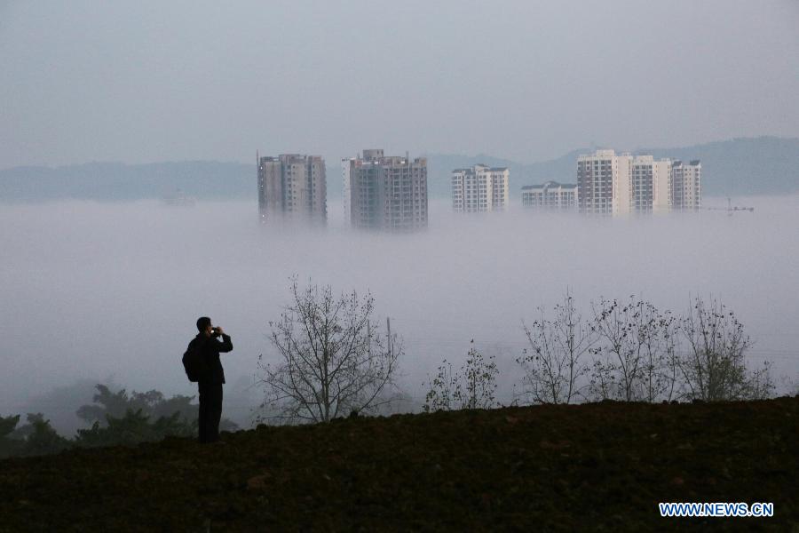 A few high-rise buildings penetrate through a stratus cloud that casts over Dazu District of southwest China's Chongqing, early on Nov. 14, 2014. (Xinhua/Luo Guojia)