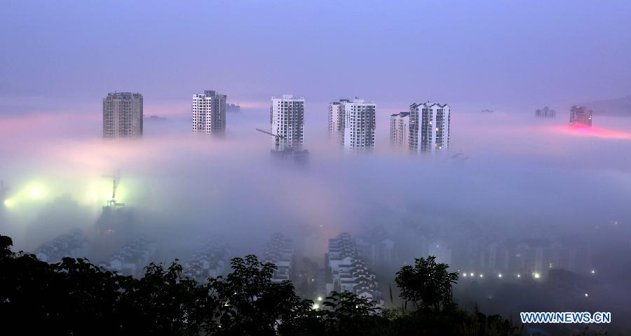 A few high-rise buildings penetrate through a stratus cloud that casts over Dazu District of southwest China's Chongqing, early on Nov. 14, 2014. (Xinhua/Luo Guojia)