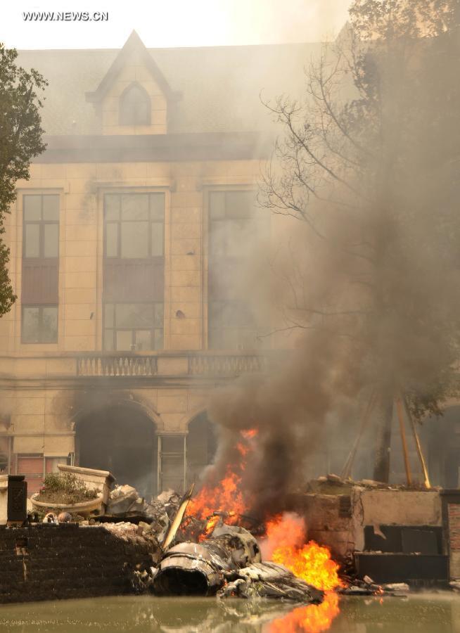 Photo taken on Nov. 15, 2014 shows the accident site of a crashed aircraft near a village in Pixian County, Chengdu, capital of southwest China's Sichuan Province. Pilots had bailed out before the aircraft fell to the ground at around 2 p.m.. Rescuers have arrived at the site. (Xinhua/Li Ze)