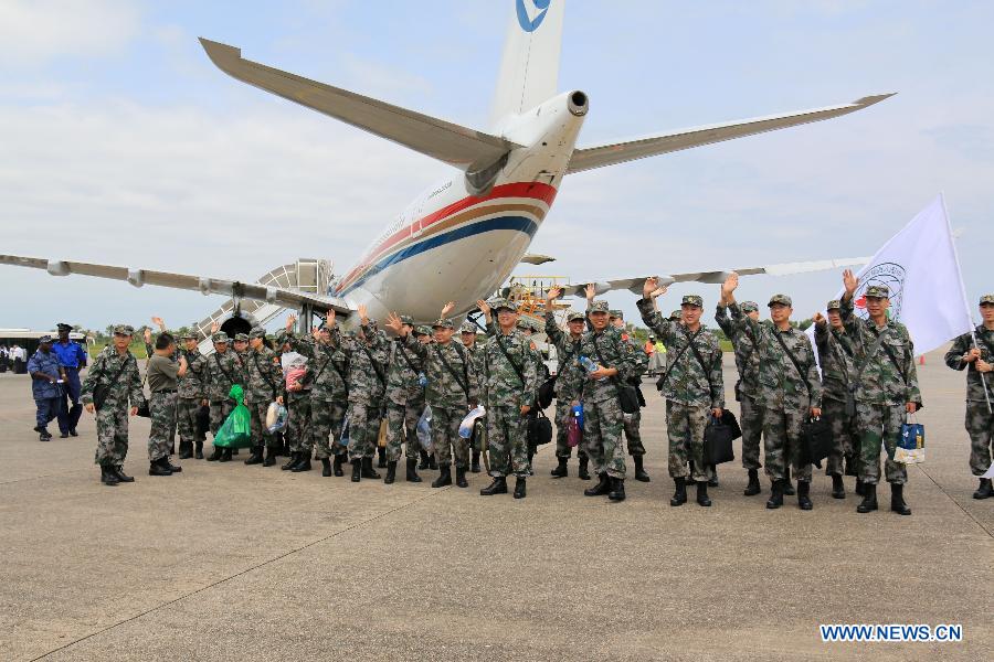 Chinese medical workers upon their arrival at the airport in Freetown, capital of Sierra Leone, Nov. 15, 2014. The second dispatch of Chinese laboratory team, including 73 medical experts from Chinese Center for Disease Control and Beijing 302 Military Hospital, arrived in Freetown on Saturday. They will continue running the mobile laboratory, which is used for testing Ebola Virus samples, and the Ebola holding center at the Sierra Leone-China Friendship Hospital, some 30 kilometres away from Freetown in the next two months. (Xinhua/Zhang Xin)