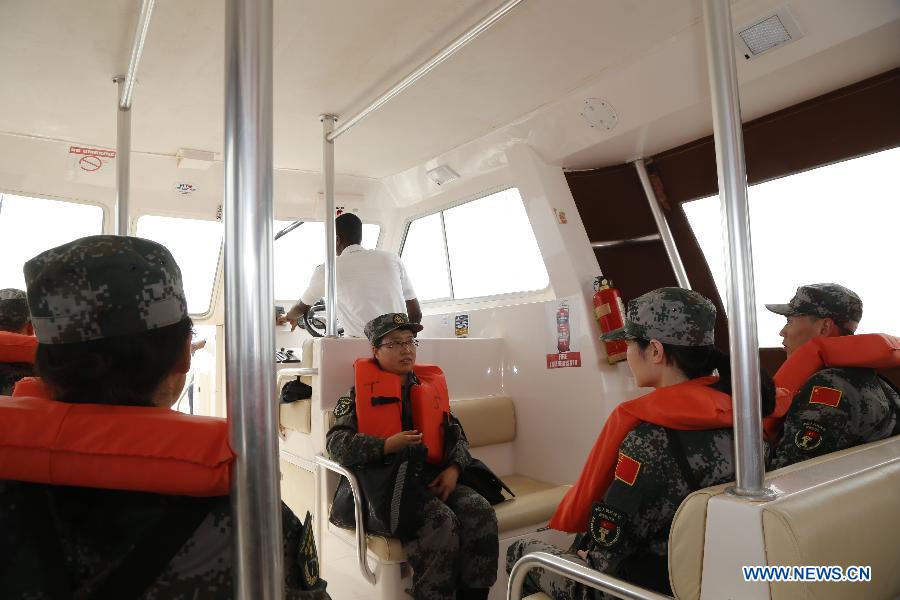 Chinese medical workers go to the downtown by boat after they arrived at the airport in Freetown, capital of Sierra Leone, Nov. 15, 2014. The second dispatch of Chinese laboratory team, including 73 medical experts from Chinese Center for Disease Control and Beijing 302 Military Hospital, arrived in Freetown on Saturday. They will continue running the mobile laboratory, which is used for testing Ebola Virus samples, and the Ebola holding center at the Sierra Leone-China Friendship Hospital, some 30 kilometres away from Freetown in the next two months. (Xinhua/Zhang Xin)