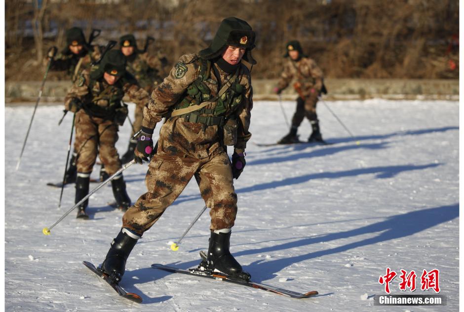 Soldiers from border defense regiments of Shenyang military region have skiing exercise braving minus 20 degree temperature. (CNS/Wei Jianshun)