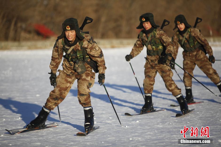 Soldiers from border defense regiments of Shenyang military region have skiing exercise braving minus 20 degree temperature. (CNS/Wei Jianshun)