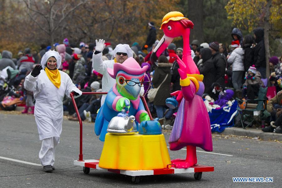 Participants wave to the crowds during the 110th Annual Toronto Santa Claus Parade in Toronto, Canada, Nov. 16, 2014. With 21 bands, 31 floats and more than 3,000 volunteers, the Parade kicked off at Toronto on Sunday. (Xinhua/Zou Zheng)