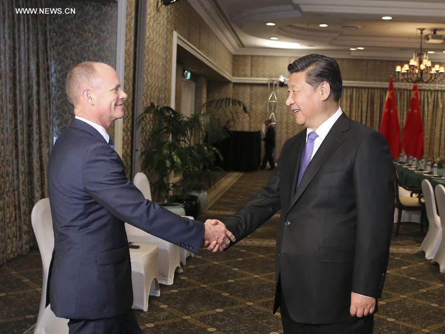| Chinese President Xi Jinping (R) shakes hands with Queensland Premier Campbell Newman during their meeting in Brisbane, Australia, Nov. 16, 2014. (Xinhua/Ding Lin) |