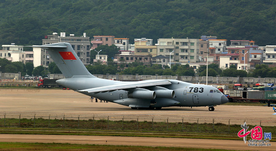 China’s self-developed heavy-duty military transport aircraft Y-20 taxis before performing aerobatics at the 2014 Zhuhai Airshow. (Photo/China.org.cn)