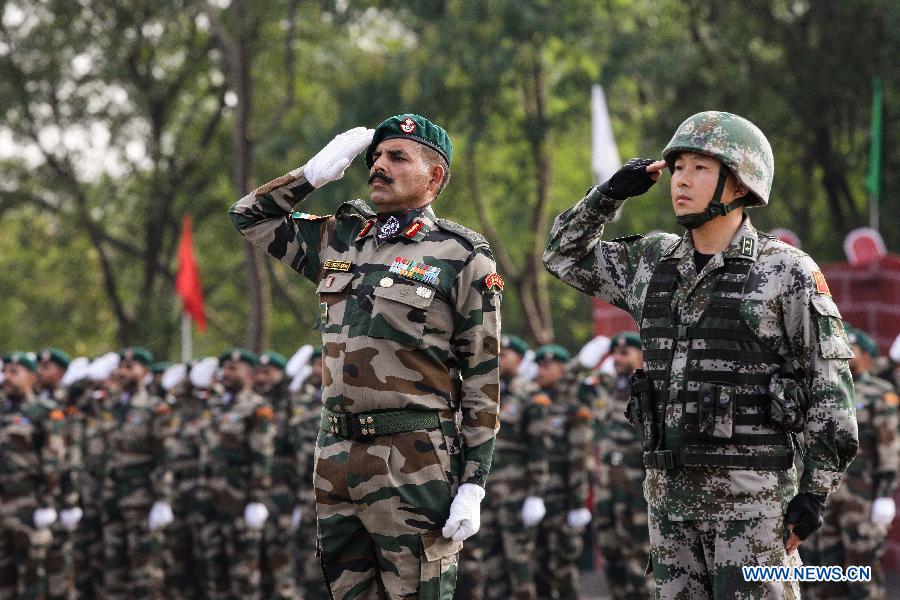 Indian and Chinese soldiers salute at the starting ceremony of the Hand-in-hand India-China Anti-Terrorism Joint Training Exercise in Pune, India, on Nov. 17, 2014. The joint counterterrorism training exercise will last for ten days. (Xinhua/Zheng Huansong)