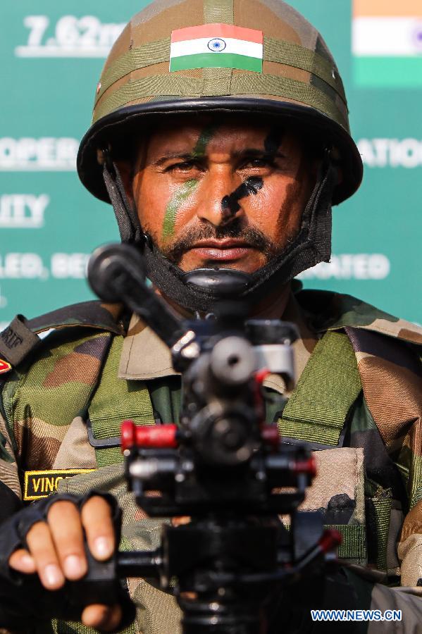 An Indian soldier shows a machine gun at the starting ceremony of the Hand-in-hand India-China Anti-Terrorism Joint Training Exercise in Pune, India, on Nov. 17, 2014. The joint counterterrorism training exercise will last for ten days. (Xinhua/Zheng Huansong)