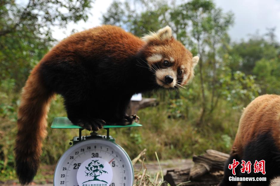 Staff members put the little panda on the scale. (CNS/Liu Ranyang)
