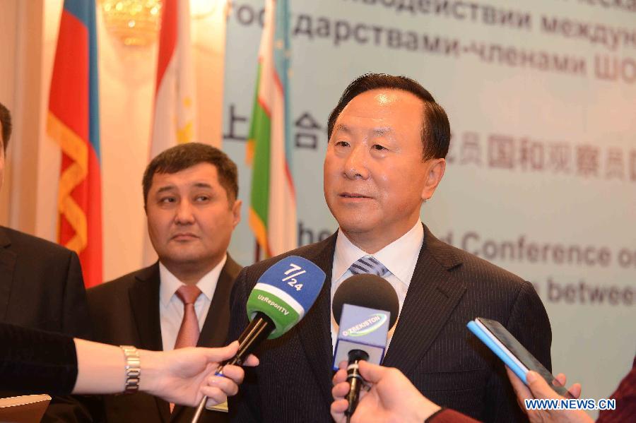 Zhang Xinfeng, director of the Executive Committee of SCO's Regional Anti-Terrorism Agency, is in an interview at the Second Conference on Cooperation against International Terrorism and Extremism between SCO Member States and Observer States, in Tashkent, capital of Uzbekistan, on Nov. 18, 2014. (Xinhua/Sadat)