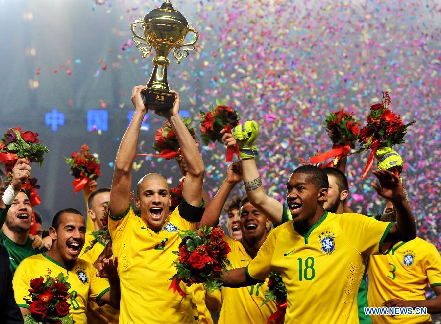 U-22 players of Brazil celebrate with trophy after the International Youth Football Tournament match against China U-22 Team in Wuhan, central China's Hubei Province, Nov. 18, 2014. Brazil defeated China with 2-1 and claimed the title after 2 wins and 1 draw.(Xinhua/Xiao Yijiu)