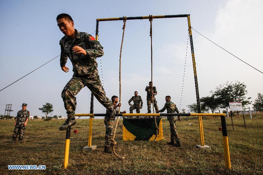 Chinese and Indian soldiers take part in the Hand-in-hand India-China Anti-Terrorism Joint Training Exercise in Pune, India, on Nov. 18, 2014. The joint counterterrorism training exercise will last for ten days. (Xinhua/Zheng Huansong)