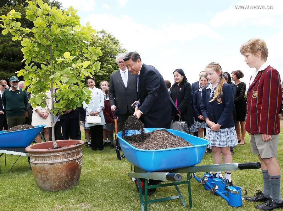 Chinese President Xi Jinping plants a tree with students of a primary school in Tasmania state, Australia, Nov. 18, 2014. (Xinhua/Yao Dawei)