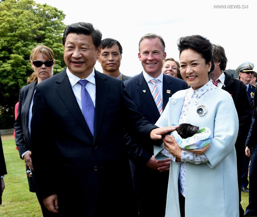 Chinese President Xi Jinping and his wife Peng Liyuan pet a Tasmanian devil after planting a tree with students of a primary school in Tasmania state, Australia, Nov. 18, 2014. (Xinhua/Rao Aimin)