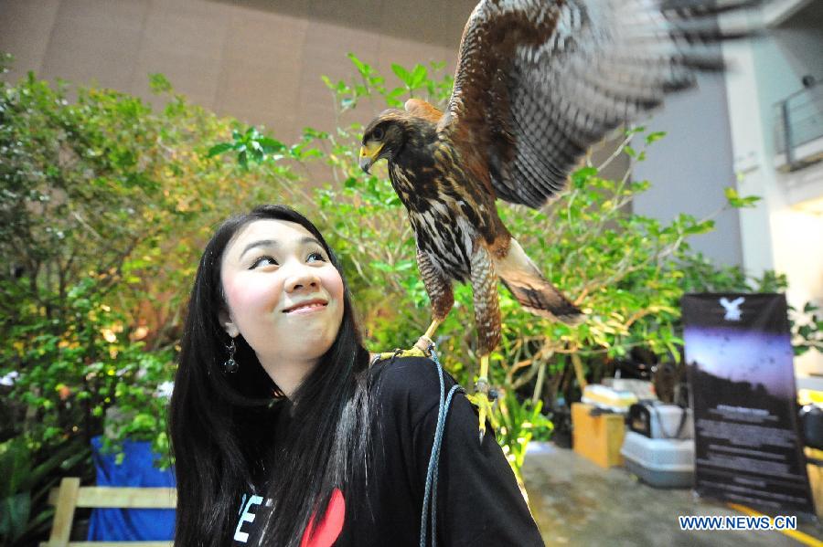 A woman looks at a harris's hawk during the exhibition of Pet Variety And The City 2014 at Impact Muang Thong Thani in Bangkok, Thailand, Nov. 20, 2014. The exhibition was held here on Nov. 20-23. (Xinhua/Rachen Sageamsak)