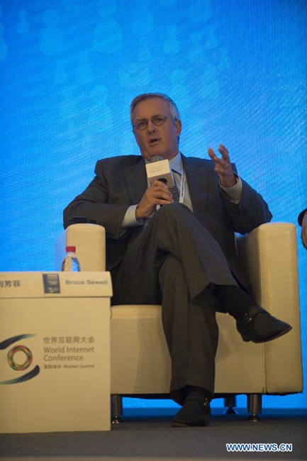 Bruce Sewell, senior vice president of Apple Inc., addresses the Chinese and Foreign Internet Leaders Summit during the World Internet Conference in Wuzhen, east China's Zhejiang Province, Nov. 20, 2014. Representatives from nearly 100 countries and regions took part in the three-day 2014 World Internet Conference that kicked off Wednesday in Wuzhen. (Xinhua/Ju Huanzong)