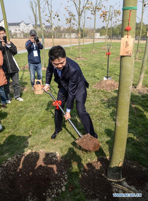 | Liu Qiangdong (front), CEO of e-commerce company JD.com, plants a tree to mark the 2014 World Internet Conference in Wuzhen, east China's Zhejiang Province, Nov. 20, 2014. (Xinhua/Xu Yu) |
