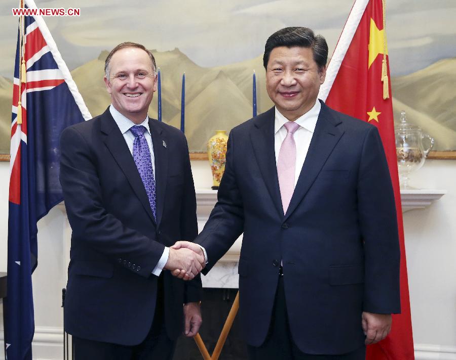 | Chinese President Xi Jinping (R) shakes hands with New Zealand's Prime Minister John Key in Wellington, New Zealand, Nov. 20, 2014. Xi Jinping and John Key held talks in Wellington on Thursday. (Xinhua/Yao Dawei) |