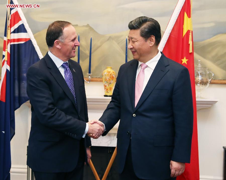 Chinese President Xi Jinping (R) shakes hands with New Zealand's Prime Minister John Key in Wellington, New Zealand, Nov. 20, 2014. Xi Jinping and John Key held talks in Wellington on Thursday. (Xinhua/Ma Zhancheng)